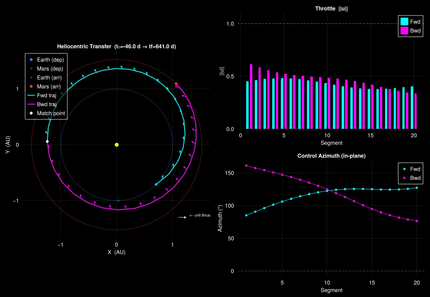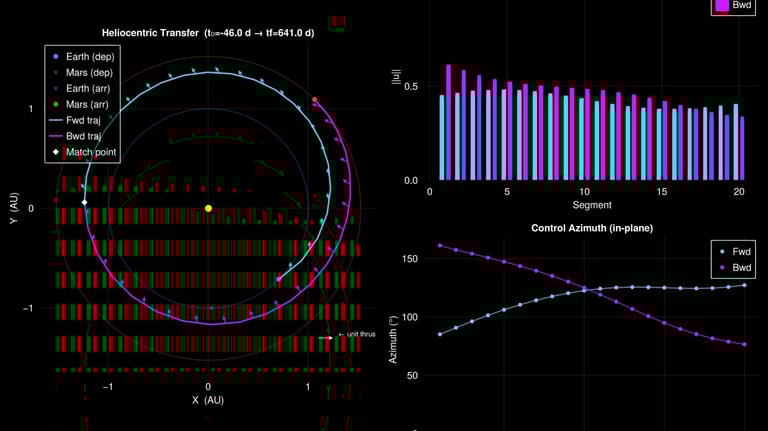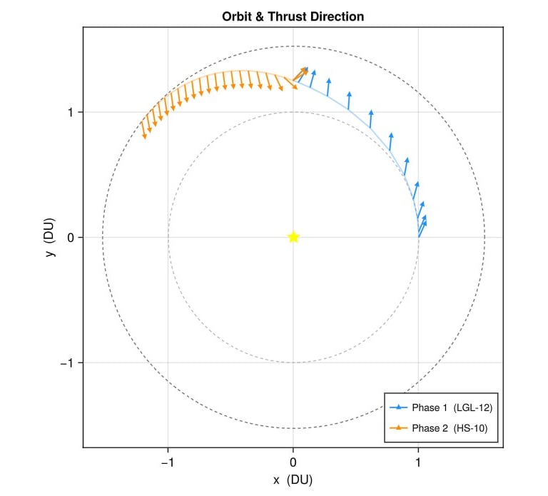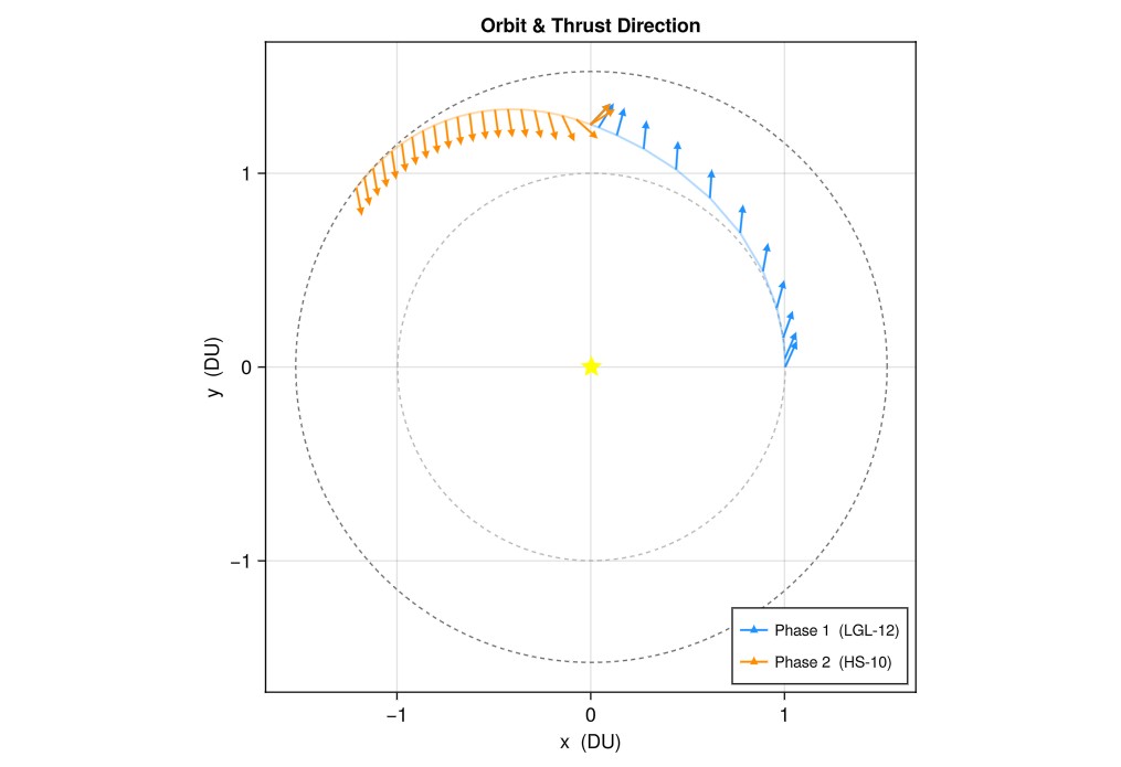 At the framework level, Epicycle provides a flexible foundation for optimal control and estimation. It supports multiple transcription methods, including Sims–Flanagan, Legendre–Gauss–Lobatto, and Hermite–Simpson, with analytic partial derivatives to enable efficient large-scale optimization. The architecture is designed to extend naturally into navigation, supporting both traditional estimation techniques and the use of nonlinear programming solvers to solve estimation problems within the same unified framework.