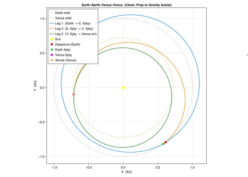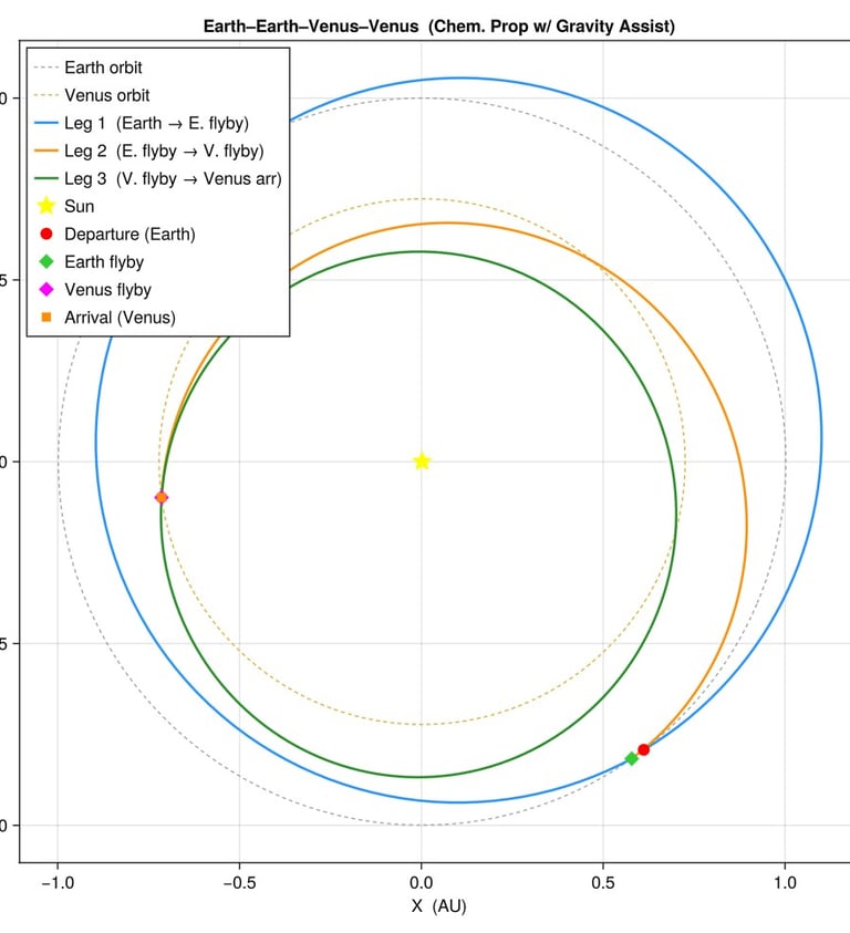 Venus transfer with multiple gravity assists. Optimized with multiple shooting (analytic partials) and monotonic basin hopping.